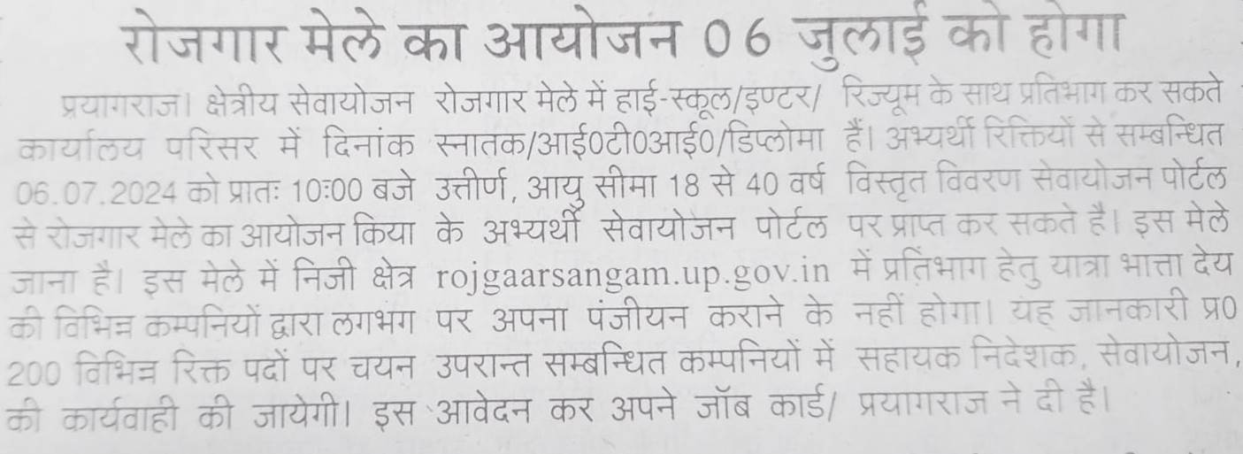 रोजगार मेले का आयोजन 06 जुलाई को होगा/The employment fair will be organised on 6th July.