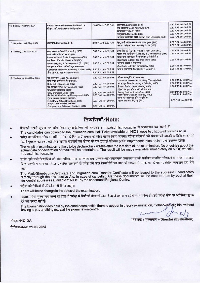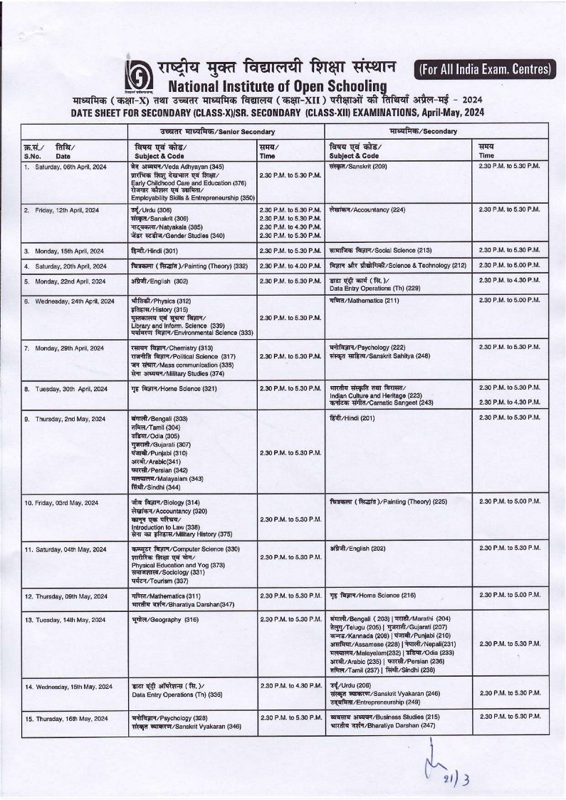 माध्यमिक (कक्षा-दसवीं)/उच्चतर माध्यमिक (कक्षा-बारहवीं) परीक्षाओं के लिए तिथियाँ, अप्रैल-मई 2024/ Date sheet for Secondary (Class-X)/Higher Secondary (Class-XII) Examinations, April-May 2024
