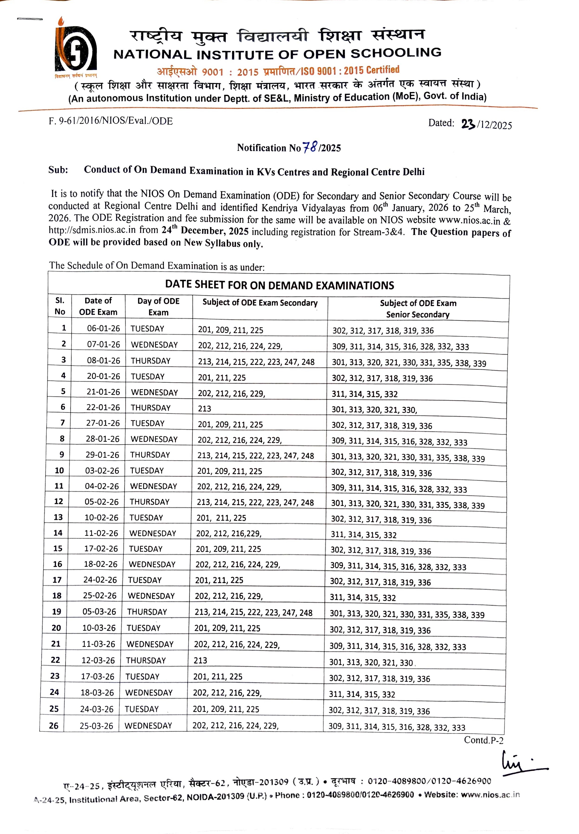 Conduct of On Demand Examination in KVs Centres and Regional Centre Delhi Jan,Feb & Mar-2026