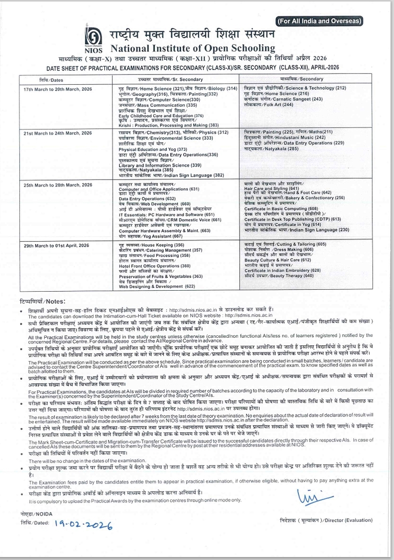 DATE SHEET OF PRACTICAL EXAMINATIONS FOR SECONDARY (CLASS-X)/SR. SECONDARY (CLASS-XII), APRIL-2026