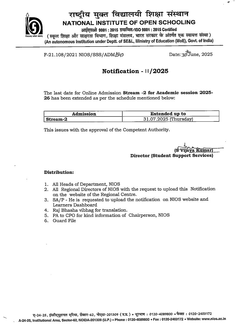 Last date for Stream-2 Online Admission is extended for Academic Session-2025-26