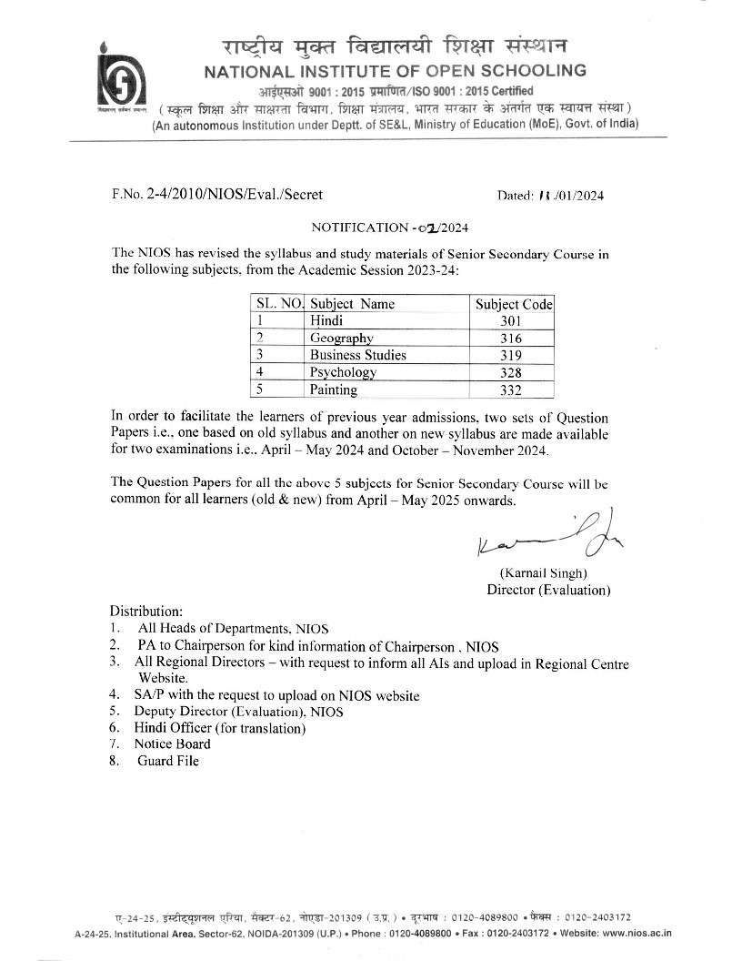 Notification: NIOS has revised the syllabus and study materials of Senior Secondary Course