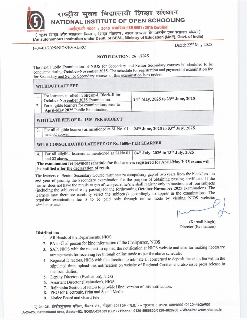 Public Examination Fee Schedule for Secondary and Senior Secondary For October-November 2025 Exam